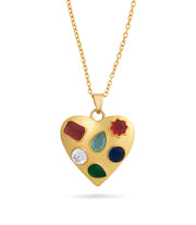 Heart-shaped pendant with coloured stones. A subtle yet playful statement.